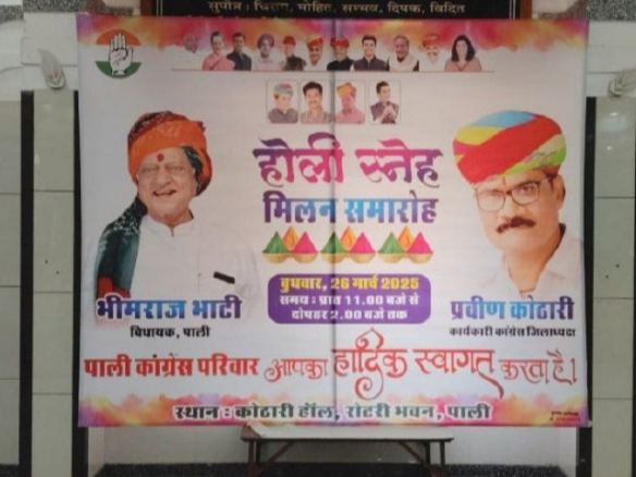 होली स्नेह मिलान का आयोजन कांग्रेस द्वारा बुधवार को रोटरी क्लब ऑफ पाली में किया गया था। जिसमें कांग्रेसी पूरे जिले से पहुंचे। इस दौरान जिले में कांग्रेस को मजबूत करने के लिए चर्चा आयोजित की गई। लेकिन विशेष बात यह थी कि कांग्रेस के कार्यकारी जिला अध्यक्ष प्रवीण