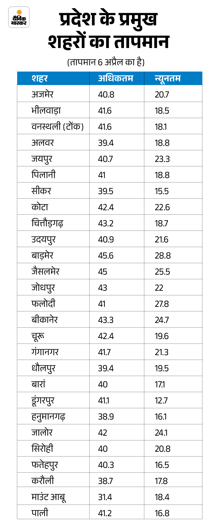 कल अजमेर में अधिकतम तापमान, 40.8 डिग्री सेल्सियस, भिल्वारा में 41.6, वनास्थली (टोंक), 41 पिलानी में 41, कोटा में 42.4, उदयपुर में 43.9, चिटोरगढ़ में 43, जोधपुर में 43, 43.3 में 43.3, 43.3 में 43.3, 43.3, 43.3, 43.3, 43.3, 43.3 में 43.3, 43.3, 43.3, 43.3 में 43.3, 43.3, 43.3 में 43.3, 43.3 में 43.3, 43.3 जलोर, 41.2, 41.2, 41.2, 41.2, 40.3 सिरोही में, बरन, फतेहपुर में 40.3 और डूंगरपुर में 41.1 डिग्री सेल्सियस।