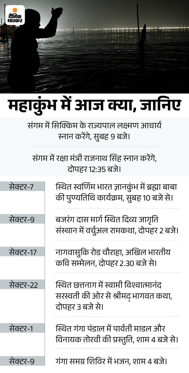 रक्षा मंत्री राजनाथ सिंह ने दोपहर में संगम में डुबकी लगाई। उनके पहुंचने से पहले आर्मी ने पूरे किला घाट को अपने कब्जे में ले लिया था। राजनाथ साधु-संतों से मुलाकात और सेना के अफसरों के साथ मीटिंग भी करेंगे। देर रात शहर और महाकुंभ क्षेत्र में आर्मी और पुलिस के जवानों ने चेकिंग की। 18 संदिग्ध लोगों को पकड़ा। इनमें से कुछ के पास आधार कार्ड नहीं थे। कई को चोरी के शक में पकड़ा।
