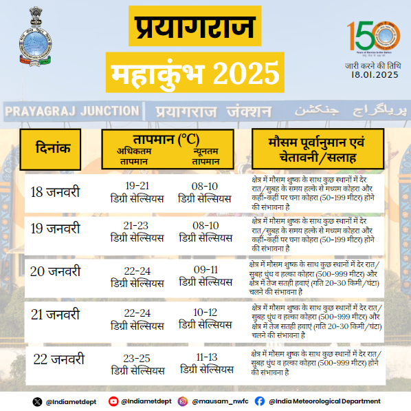 भारत मौसम विज्ञान विभाग (IMD) ने महाकुंभ में 18 से 22 जनवरी तक के मौसम का पूर्वानुमान जारी किया है। इन दिनों रात से सुबह तक कोहरे का अनुमान है।