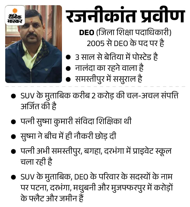 ਇਹ ਜਾਇਦਾਦ ਗੈਰ-ਕਾਨੂੰਨੀ ਢੰਗ ਨਾਲ ਹਾਸਲ ਕੀਤੀ ਗਈ ਹੈ। ਰਜਨੀਕਾਂਤ 2005 ਤੋਂ ਨੌਕਰੀ ‘ਤੇ ਹਨ। ਉਸਨੇ ਦਰਭੰਗਾ, ਸਮਸਤੀਪੁਰ, ਮਧੂਬਨੀ ਅਤੇ ਹੋਰ ਜ਼ਿਲ੍ਹਿਆਂ ਵਿੱਚ ਸਿੱਖਿਆ ਅਧਿਕਾਰੀ ਵਜੋਂ ਕੰਮ ਕੀਤਾ ਹੈ। ਉਸ ‘ਤੇ 19-20 ਸਾਲ ਦੀ ਸੇਵਾ ਦੌਰਾਨ ਆਪਣੇ ਅਹੁਦੇ ਦੀ ਦੁਰਵਰਤੋਂ ਕਰਕੇ ਗੈਰ-ਕਾਨੂੰਨੀ ਦੌਲਤ ਹਾਸਲ ਕਰਨ ਦਾ ਦੋਸ਼ ਹੈ।