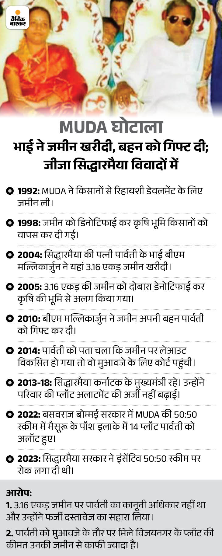 - ਸ੍ਰੀਮਤੀ ਬੀ ਐਮ ਪਾਰਵਾਥੀ ਨੂੰ ਇਨ੍ਹਾਂ ਸਾਈਟਾਂ ਦੇ ਗੈਰ ਕਾਨੂੰਨੀ ਅਲਾਟਮੈਂਟ ਵਿੱਚ ਸਾਬਕਾ ਮੁਦ ਕਮਿਸ਼ਨਰ ਡੀ ਬੀ ਨਤਾਸ ਨੇ ਇੱਕ ਮਹੱਤਵਪੂਰਨ ਭੂਮਿਕਾ ਨਿਭਾਈ.