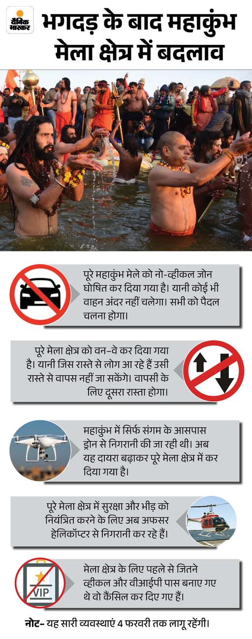 मेला क्षेत्र को पूरी तरह से नो-व्हीकल जोन घोषित कर दिया है। VVIP पास भी रद्द कर दिए गए हैं। यह नियम 4 फरवरी तक लागू रहेंगे। ज्यादातर गाड़ियां शहर की सीमाओं पर फंसी हैं।