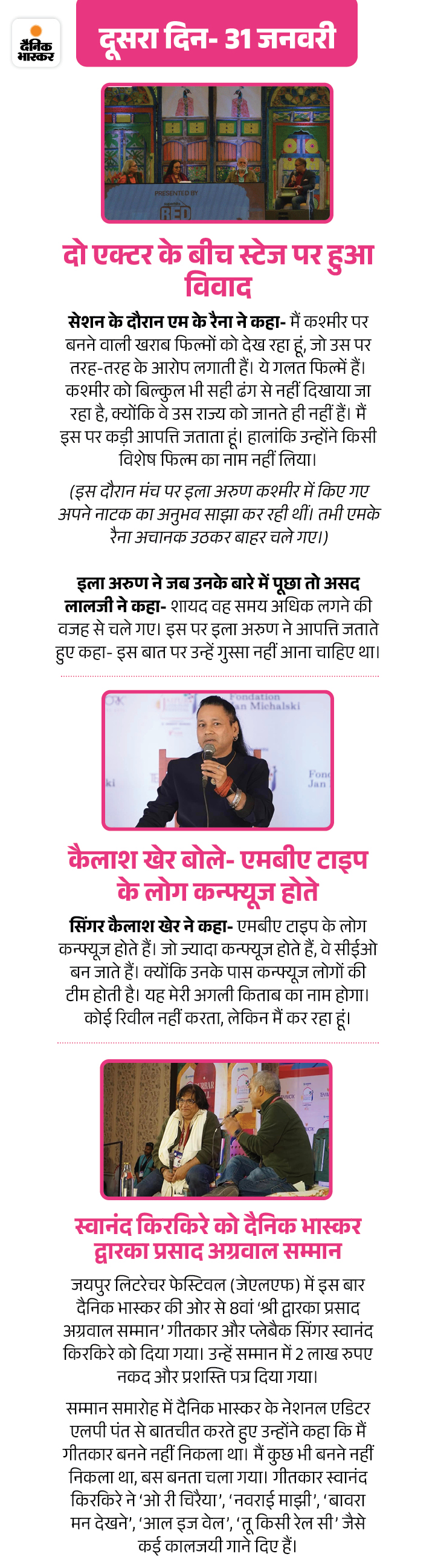 ਜੇਲਫ (31 ਜਨਵਰੀ) ਅਦਾਕਾਰ ਦੇ ਦੂਜੇ ਦਿਨ ਅਦਾਕਾਰ ਇਲੁਣ ਦੀ ਅਰੁਣ ਕਸ਼ਮੀਰ ਦੀ ਗੱਲ ਕਰ ਰਿਹਾ ਸੀ. ਅਦਾਕਾਰ ਐਮ ਕੇ ਰੈਨਾ ਨੇ ਪਿੱਛੇ ਤੋਂ ਸਟੇਜ ਛੱਡ ਦਿੱਤਾ.