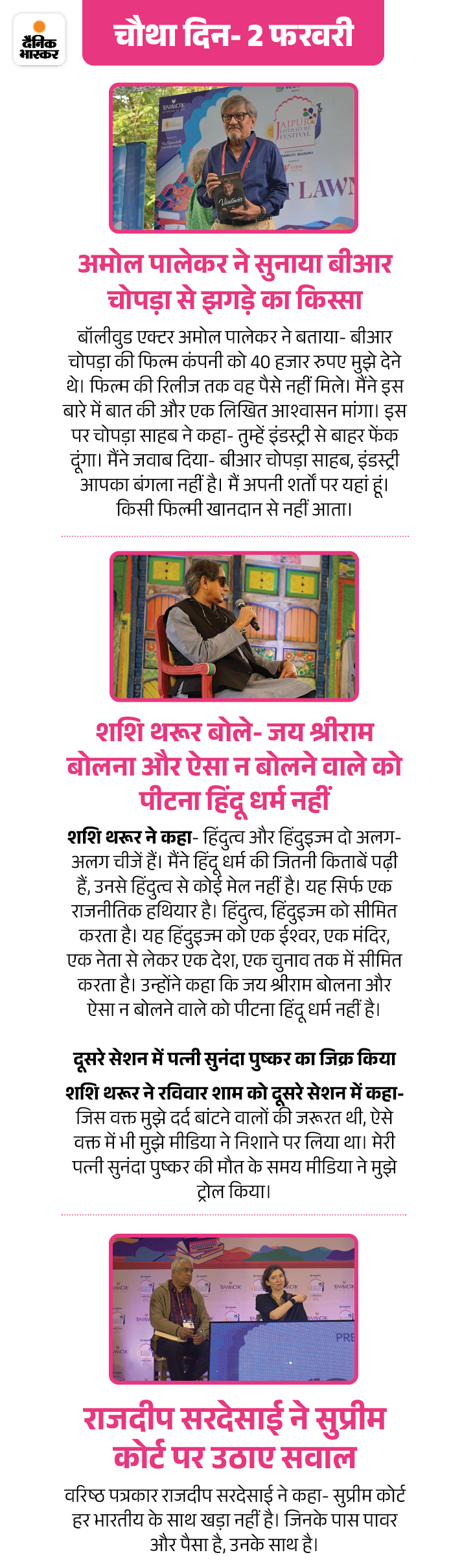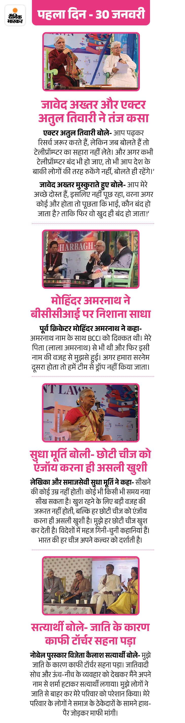 ਜੈਪੁਰ ਵਿਚ ਪੰਜ ਦਿਨਾਂ (30 ਜਨਵਰੀ ਤੋਂ 3 ਫਰਵਰੀ) ਤੋਂ ਰਵਾਇਤ ਦਾ ਜਸ਼ਨ ਜੈਪੁਰ ਨੇ ਸੋਮਵਾਰ ਨੂੰ ਜੈਪੁਰ ਸਾਹਿਤ ਉਤਸਵ (ਜੇ.ਐੱਨ.ਐੱਨਫ) ਵਿਖੇ ਖਤਮ ਹੋ ਗਿਆ. ਇਹ ਤਿਉਹਾਰ ਇਸ ਫੈਸਲੇਵਲ ਵਿੱਚ ਬਾਲੀਵੁੱਡ, ਕ੍ਰਿਕਟ, ਰਾਜਨੀਤਿਕ ਅਤੇ ਸਾਹਿਤ ਨਾਲ ਸਬੰਧਤ ਬਹੁਤ ਸਾਰੇ ਚਿਹਰੇ ਹਨ. ਉਨ੍ਹਾਂ ਦੀ ਜ਼ਿੰਦਗੀ ਤੋਂ ਦੇਸ਼ ਤੱਕ ਹਰ ਕੋਈ