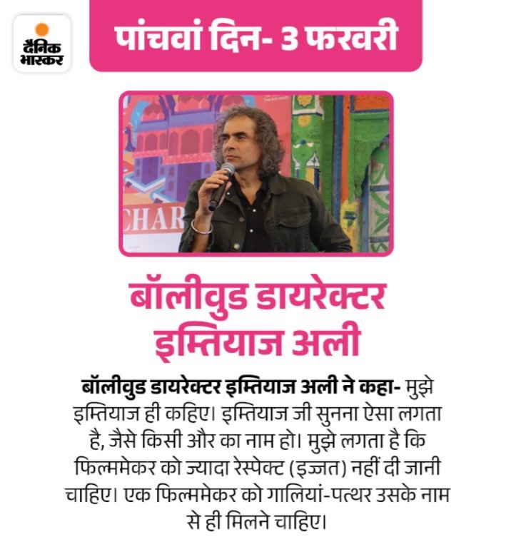 ਜੈਪੁਰ ਸਾਹਿਤ ਦਾ ਤਿਉਹਾਰ (ਜੇਐਫਐਲ) ਸੋਮਵਾਰ ਨੂੰ ਖਤਮ ਹੋਇਆ. ਜੇਲਫ ਅਗਲੇ ਸਾਲ 15 ਤੋਂ 19 ਜਨਵਰੀ ਤੱਕ ਹੋਵੇਗਾ. ਜੇਲਫ ਦੇ ਨਿਰਦੇਸ਼ਕ ਦੇ ਆਖਰੀ ਦਿਨ, ਫਿਲਮ ਨਿਰਦੇਸ਼ਕ ਇਮੀ ਆਈ ਅਜਿਹਾ ਲਗਦਾ ਹੈ ਜਿਵੇਂ ਕਿਸੇ ਹੋਰ ਦਾ ਨਾਮ ਹੁੰਦਾ ਹੈ. ਮੈਨੂੰ ਲਗਦਾ ਹੈ ਕਿ ਫਿਲਮ ਨਿਰਮਾਤਾ ਨੂੰ ਬਹੁਤ ਸਤਿਕਾਰ ਨਹੀਂ ਕੀਤਾ ਜਾਣਾ ਚਾਹੀਦਾ. ਇੱਕ ਫਿਲਮ ਨਿਰਮਾਤਾ ਨੂੰ ਉਸਦੇ ਨਾਮ ਤੇ ਦੁਰਵਿਵਹਾਰ ਅਤੇ ਪੱਥਰ ਪ੍ਰਾਪਤ ਕਰਨੇ ਚਾਹੀਦੇ ਹਨ. ,ਪੂਰੀ ਖ਼ਬਰਾਂ ਪੜ੍ਹੋ,
