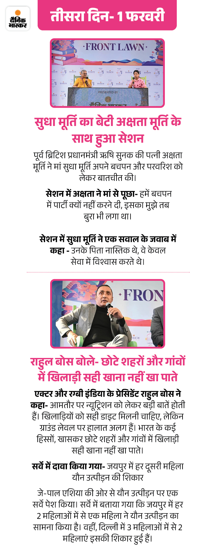 ਜੈਪੁਰ ਸਾਹਿਤ ਦੇ ਤਿਉਹਾਰ ‘ਤੇ ਬ੍ਰਿਟਿਸ਼ ਵਿਰੋਧੀ ਮੰਤਰੀ ਰਿਸ਼ੀ ਸਨਕ ਦੀ ਪਤਨੀ ਅਕਸ਼ਤਾ ਮੁਰਛਿ-ਪਤਨੀ ਨੇ ਆਪਣੇ ਬਚਪਨ ਅਤੇ ਪਾਲਣ ਪੋਸ਼ਣ ਬਾਰੇ ਗੱਲ ਕੀਤੀ. ਸਾਹਮਣੇ ਲਾਅਨ ਵਿਚ ਹੋਇਆ ਮੇਰੀ ਮਾਂ ਮੇਰੀ ਜ਼ਿੰਦਗੀ ਸੈਸ਼ਨ ਵਿੱਚ, ਅਕਸ਼ਤਾ ਨੇ ਮਾਂ ਨੂੰ ਪੁੱਛਿਆ ਕਿ ਉਸਨੇ ਬੱਚੇ ਦੀ ਪਾਰਟੀ ਕਿਉਂ ਨਹੀਂ ਦਿੱਤੀ, ਮੈਨੂੰ ਇਸ ਬਾਰੇ ਬੁਰਾ ਮਹਿਸੂਸ ਹੋਇਆ. ,ਪੂਰੀ ਖ਼ਬਰਾਂ ਪੜ੍ਹੋ,
