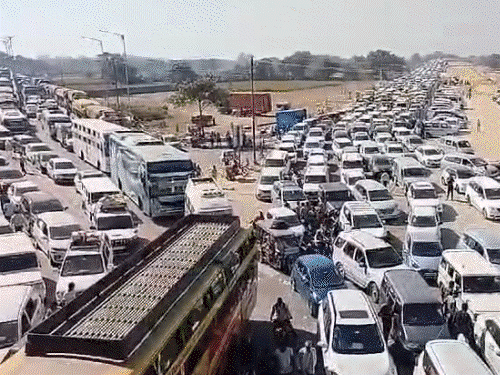 प्रयागराज से लखनऊ आने वाले रास्ते में दोनों 7 से 10 किमी तक वाहनों की लंबी लाइन लगी है।