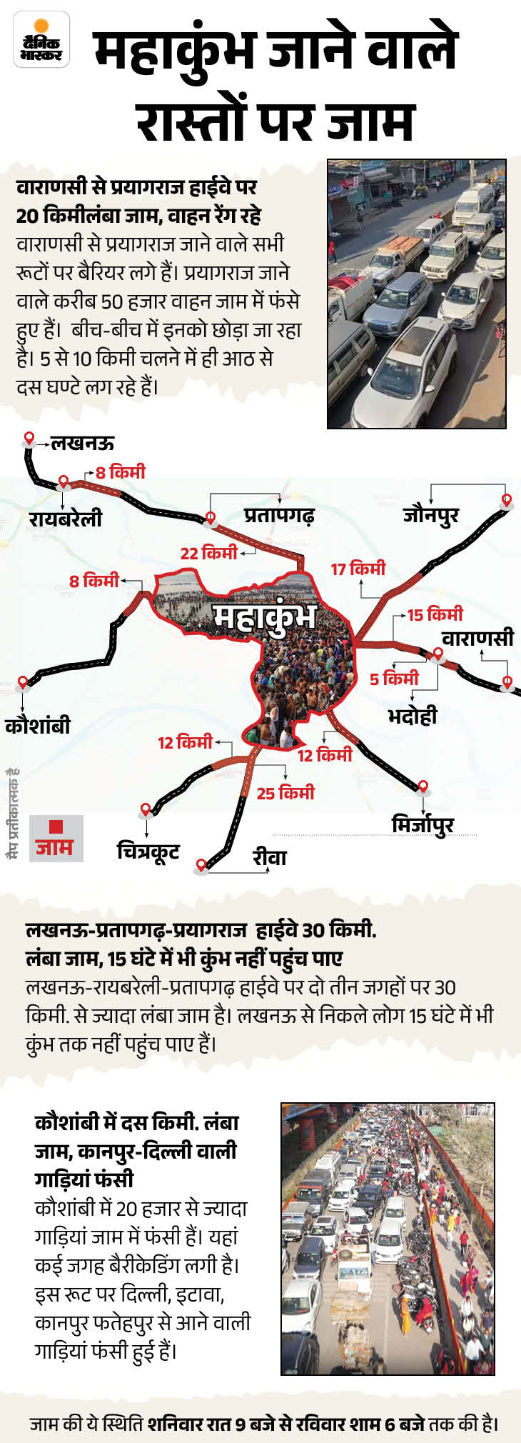 प्रयागराज में आस्था का जनसैलाब कम नहीं हो रहा। लोग संगम में डुबकी लगाने को आतुर लगातार महाकुंभ क्षेत्र की ओर बढ़ रहे है। कानपुर से प्रयागराज हाइवे पर ट्रैफिक में लोग कई कई घंटे फंसे हुए है। दैनिक भास्कर ने कानपुर हाईवे की हालत देखने 40 किलोमीटर दूर कौशांबी के कोखराज बॉर्डर से ट्रैफिक का हाल आपको बता रहा है। श्रद्धालु कई घंटे से जाम में सड़क पर रेंग रहे है।