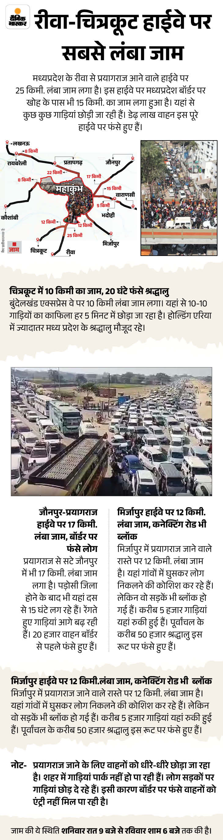 महाकुंभ में जा रहे अलग-अलग राज्यों के श्रद्धालु रीवा-प्रयागराज बॉर्डर पर जाम में फंसे हैं।