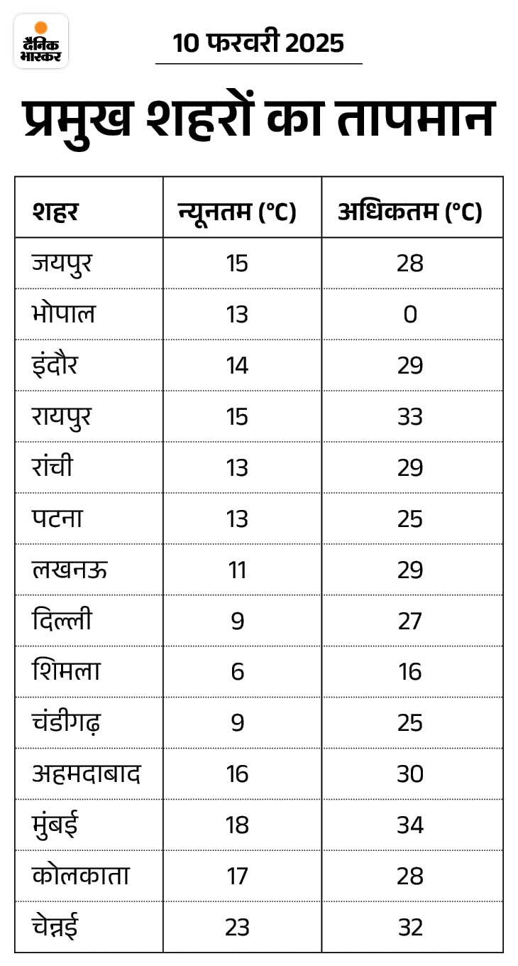 ਰਾਜਸਥਾਨ ਵਿੱਚ ਤੇਜ਼ੀ ਨਾਲ ਦਿਨ ਦਾ ਤਾਪਮਾਨ ਤੇਜ਼ੀ ਨਾਲ ਵੱਧ ਰਿਹਾ ਹੈ. ਪਿਛਲੇ 24 ਘੰਟਿਆਂ ਦੌਰਾਨ, ਬਾਰਮਰ ਨੇ ਇੱਥੇ ਸਭ ਤੋਂ ਵੱਧ ਤਾਪਮਾਨ 32.9 ਡਿਗਰੀ ਸੈਲਸੀਅਸ ਰਿਕਾਰਡ ਕੀਤਾ, ਜੋ ਕਿ ਇੱਥੇ ਸਤਿਕਾਰ ਦੇ 4 ਡਿਗਰੀ ਸੈਲਸੀਅਸ ਰਿਹਾ. ਅਗਲੇ 4-5 ਦਿਨ ਇਕੋ ਮੌਸਮ ਹੋਣਗੇ. ਮੱਧ ਪ੍ਰਦੇਸ਼ ਵਿੱਚ ਵੀ ਦਿਨ ਦੌਰਾਨ ਤਾਪਮਾਨ ਵੱਧ ਰਿਹਾ ਹੈ.