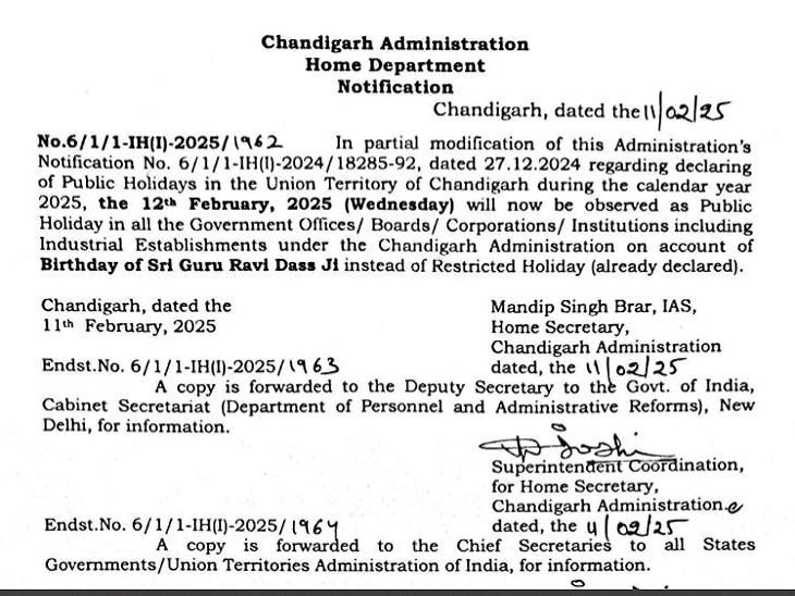 ਚੰਡੀਗੜ੍ਹ ਪ੍ਰਸ਼ਾਸਨ ਨੇ ਸ਼ਮਸ਼ਾਨ ਕਰਨ ਵਾਲੇ ਸ਼੍ਰੀ ਗੁਰੂ ਰਵਿਦਾਸ ਜੈਯੰਤੀ ਨੂੰ ਯਾਦ ਕਰਨ ਲਈ ਕੱਲ੍ਹ 12 ਫਰਵਰੀ ਦੀ ਛੁੱਟੀ ਘੋਸ਼ਿਤ ਕੀਤੀ ਹੈ. ਇਸ ਸਮੇਂ ਦੇ ਦੌਰਾਨ, ਸਰਕਾਰੀ ਦਫਤਰਾਂ, ਬੋਰਡਾਂ ਨੇ ਪ੍ਰਸ਼ਾਸਨ ਦੇ ਅਧੀਨ ਆਉਣ ਵਾਲੀਆਂ ਸਾਰੀਆਂ ਉਦਯੋਗਿਕ ਸੰਸਥਾਵਾਂ ਵਿੱਚ ਇੱਕ ਛੁੱਟੀ ਹੋਏਗੀ. ਇਸ ਸੰਬੰਧ ਵਿਚ ਪ੍ਰਸ਼ਾਸਨ ਨੇ ਆਦੇਸ਼ ਜਾਰੀ ਕੀਤੇ ਹਨ.