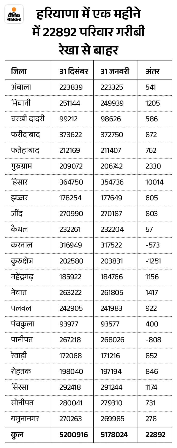 ਹਰਿਆਣਾ ਵਿਚ, ਲਗਭਗ 23 ਹਜ਼ਾਰ ਪਰਿਵਾਰ ਇਕ ਮਹੀਨੇ ਦੇ ਅੰਦਰ ਅਮੀਰ ਹੋ ਗਏ. ਜਿਸ ਤੋਂ ਬਾਅਦ ਉਨ੍ਹਾਂ ਨੂੰ ਗਰੀਬੀ ਰੇਖਾ ਵਿੱਚੋਂ ਬਾਹਰ ਸੁੱਟ ਦਿੱਤਾ ਗਿਆ. ਹਰਿਆਣਾ ਸਰਕਾਰ ਨੇ ਇਸ ਦੀ ਪ੍ਰਾਪਤੀ ਵਜੋਂ ਦਰਸਾਇਆ ਹੈ. ਰਾਜ ਦੇ ਸਿਵਲ ਸਰੋਤ ਜਾਣਕਾਰੀ ਵਿਭਾਗ ਨੇ ਇਹ ਅੰਕੜੇ ਜਾਰੀ ਕੀਤੇ ਹਨ.