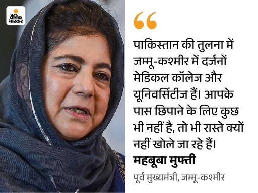 ਪੀਪਲਜ਼ ਡੈਮੋਕ੍ਰੇਟਿਕ ਪਾਰਟੀ (ਪੀਡੀਪੀ) ਦੇ ਪ੍ਰਧਾਨ ਮਹਿਬੂਬਾ ਮੁਫਤੀ ਨੇ ਕਿਹਾ ਕਿ ਨਰਿੰਦਰ ਮੋਦੀ ਅਤੇ ਅਮਿਤ ਸ਼ਾਹ ਨੇ ਜੰਮੂ-ਕਸ਼ਮੀਰ ਵਿੱਚ ਸਭ ਕੁਝ ਠੀਕ ਹੈ. ਜੇ ਸਭ ਠੀਕ ਹੈ, ਤਾਂ ਪਾਕਿਸਤਾਨ ਨਾਲ ਰਾਹ ਖੋਲ੍ਹੋ. ਤਾਂ ਜੋ ਉਹ ਇੱਥੇ ਆ ਸਕਣ ਅਤੇ ਵੇਖੋ ਕਿ ਅਸੀਂ ਕਿਵੇਂ ਜੀ ਰਹੇ ਹਾਂ ਅਤੇ ਸਾਡੇ ਕੋਲ ਜੋ ਇਥੇ ਹੈ.