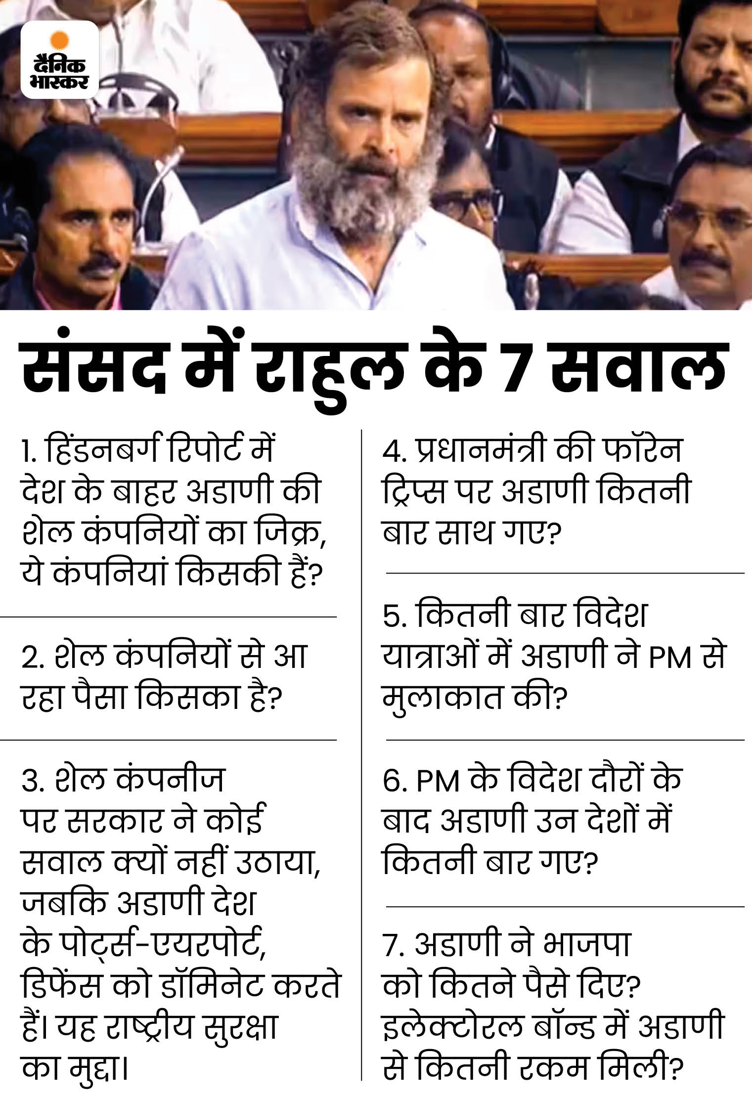 ਰਾਹੁਲ ਨੇ 7 ਫਰਵਰੀ ਨੂੰ ਸਦਨ ਵਿੱਚ ਇੱਕ ਤਸਵੀਰ ਦਿਖਾਈ, ਜਿਸ ਵਿੱਚ ਮੋਦੀ ਅਤੇ ਗੌਤਮ ਅਡਾਨੀ ਨੂੰ ਵੇਖਿਆ ਗਿਆ. ਇਸ ਦਾ ਐਨਡੀਏ ਦੇ ਮੈਂਬਰਾਂ ਨੇ ਵਿਰੋਧ ਕੀਤਾ ਸੀ. ਓਮ ਬਿਰਲਾ ਨੇ ਰਾਹੁਲ ਅਤੇ ਭਾਸ਼ਣ ਦੁਬਾਰਾ ਸ਼ੁਰੂ ਕੀਤੇ. ਰਾਹੁਲ ਨੇ ਕਿਹਾ, “ਭਾਰਤ ਦੇ ਪ੍ਰਧਾਨ ਮੰਤਰੀ ਅਤੇ ਕੀ ਸੰਬੰਧ ਹੈ ਨਾਲ ਆਪਣਾ ਰਿਸ਼ਤਾ ਕੀ ਹੈ?”