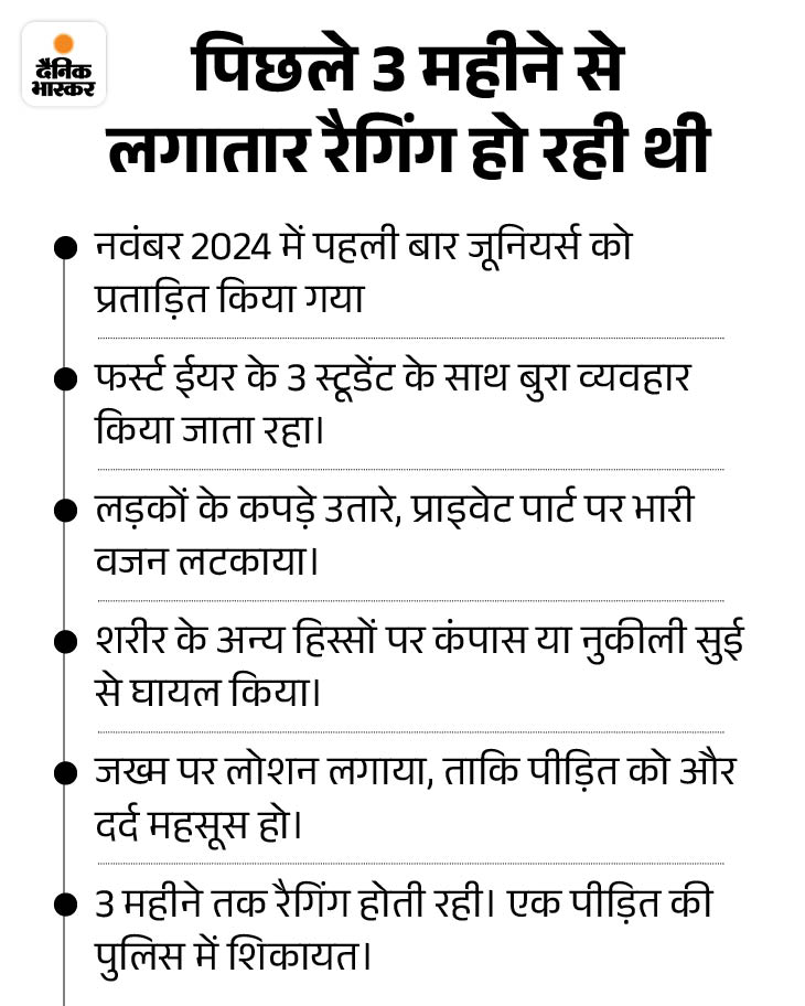 ਤਸੀਹੇ ਦੀ ਵੀਡੀਓ ਵੀ ਬਣਾਏ, ਫਿਰ ਧਮਕੀ ਦਿੱਤੀ ਬਜ਼ੁਰਗਾਂ ਨੇ ਪੀੜਤਾਂ ਨੂੰ ਨੰਕੇ ਨਾਲ ਉਨ੍ਹਾਂ ਦੇ ਰਾਗਿੰਗ ਦੀ ਵੀਡੀਓ ਵੀ ਬਣਾਈ. ਇਸਦੇ ਨਾਲ ਹੀ ਉਸਨੇ ਧਮਕਾਇਆ ਕਿ ਜੇ ਉਸਨੇ ਇਸਦੀ ਰਿਪੋਰਟ ਕਰਨ ਦੀ ਹਿੰਮਤ ਕੀਤੀ, ਉਸਨੂੰ ਗੰਭੀਰ ਨਤੀਜੇ ਭੁਗਤਣੇ ਪੈਣਗੇ. ਉਨ੍ਹਾਂ ਦੇ ਵਿਦਿਅਕ ਭਵਿੱਖ ਵੀ ਖ਼ਤਰੇ ਵਿਚ ਹੋਣਗੇ.