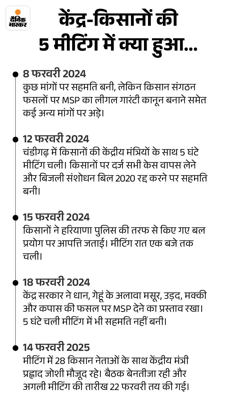 ਉਸੇ ਸਮੇਂ ਕੇਂਦਰੀ ਮੰਤਰੀ ਪ੍ਰਹਿਲਦ ਜੋਸ਼ੀ ਨੇ ਕਿਹਾ- ਸਾਡੇ ਕੋਲ ਕਿਸਾਨ ਨੇਤਾਵਾਂ ਨਾਲ ਇੱਕ ਚੰਗੇ ਮਾਹੌਲ ਵਿੱਚ ਇੱਕ ਮੀਟਿੰਗ ਸੀ. ਅਸੀਂ ਕਿਸਾਨ ਨੇਤਾਵਾਂ ਦੀਆਂ ਸਾਰੀਆਂ ਮੰਗਾਂ ਸੁਣੀਆਂ ਹਨ. ਅਸੀਂ ਉਨ੍ਹਾਂ ਨੂੰ ਕਿਸਾਨਾਂ ਲਈ ਬਜਟ ਵਿੱਚ ਲਏ ਗਏ ਫੈਸਲਿਆਂ ਬਾਰੇ ਦੱਸਿਆ. 22 ਫਰਵਰੀ ਨੂੰ, ਕੇਂਦਰੀ ਮੰਤਰੀ ਸ਼ਿਵਰਾਜ ਸਿੰਘ ਚੌਹਾਨ ਦੀ ਅਗਵਾਈ ਹੇਠ ਚੰਡੀਗੜ੍ਹ ਵਿੱਚ ਇੱਕ ਮੀਟਿੰਗ ਕਰਨਗੇ.
