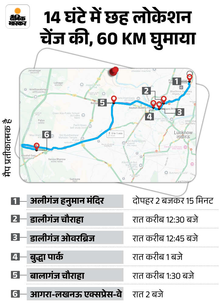 आगरा एक्सप्रेस-वे पर दिखाई बच्ची हम गाड़ी रुकने का इंतजार कर रहे थे। वहीं, संतोषी बराबर फोन कर दूसरी दलाल सोनी से लोकेशन का अपडेट ले रही थी। आगरा-लखनऊ एक्सप्रेस-वे पर रात करीब दो बजे महिला दलाल संतोषी अचानक मोबाइल पर ज्यादा सक्रिय हुई। गाड़ी को सुनसान जगह ले जाने के लिए कहने लगी।