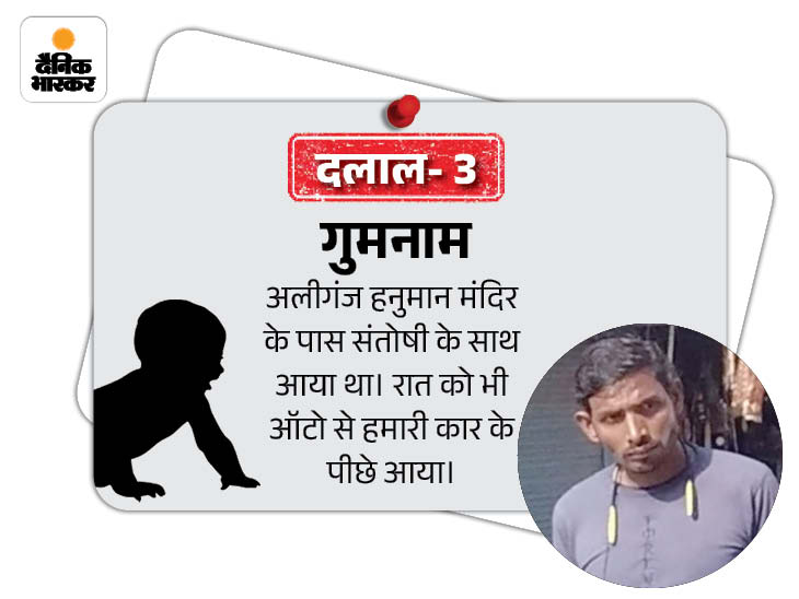 दलाल संतोषी जब दिन के समय अलीगंज के प्रसिद्ध हनुमान मंदिर के पास बच्चे का सौदा करने आई तो उसका एक साथी नजर रख रहा था। यह शख्स रात को भी हमारी गाड़ी के पीछे आया।