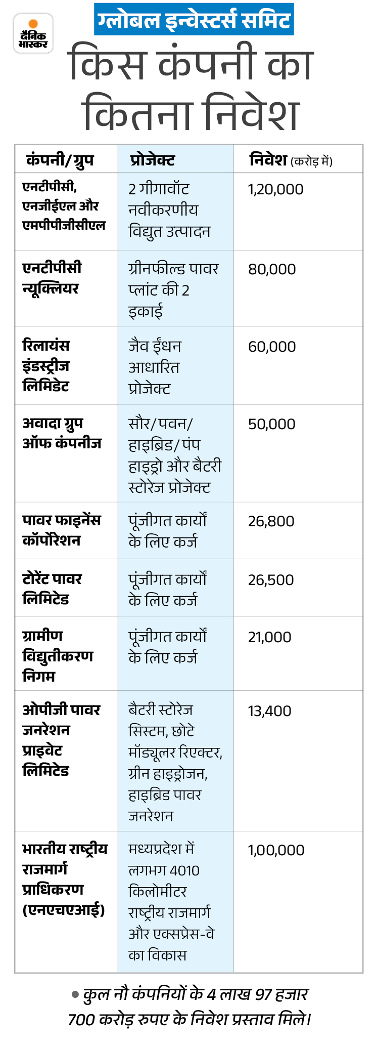 ਇਸ ਤੋਂ ਇਲਾਵਾ, ਹਿੰਦੂਵਾਦੀ ਸਮੂਹ ਸਿੰਗਰੋਲੀ ਵਿਚ 15 ਹਜ਼ਾਰ ਕਰੋੜ ਦਾ ਪੌਦਾ ਲਗਾਉਣ ਜਾ ਰਿਹਾ ਹੈ. ਅਵਾਡਾ ਸਮੂਹ ਨੇ ਸੋਲਰ ਵਿੰਡ ਪਾਵਰ ਅਤੇ ਬੈਟਰੀ ਪ੍ਰਾਜੈਕਟ 50 ਹਜ਼ਾਰ ਕਰੋੜ ਰੁਪਏ ਤੱਕ 8000 ਮੈਗਾਵਾਟ ਸਥਾਪਤ ਕਰਨ ਦੀ ਇੱਛਾ ਜ਼ਾਹਰ ਕੀਤੀ. ਉਸੇ ਸਮੇਂ, ਸਾਗਰ ਸਮੂਹ ਟੈਕਸਟਾਈਲ ਸੈਕਟਰ ਵਿਚ ਦੋ ਤੋਂ ਅੱਧੇ ਹਜ਼ਾਰ ਕਰੋੜ ਰੁਪਏ ਦਾ ਨਿਵੇਸ਼ ਕਰੇਗਾ.